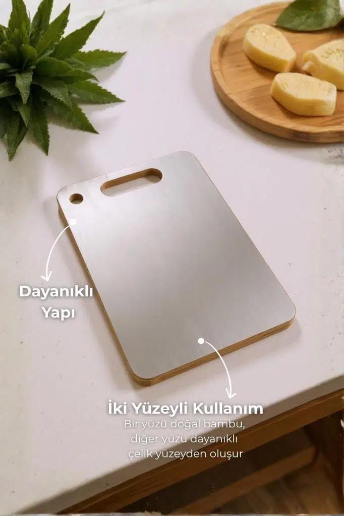 Malzeme: Bir yüzü %100 Doğal Bambu, diğer yüzü gıda ile temasa uygun Paslanmaz Çelik/Metal.