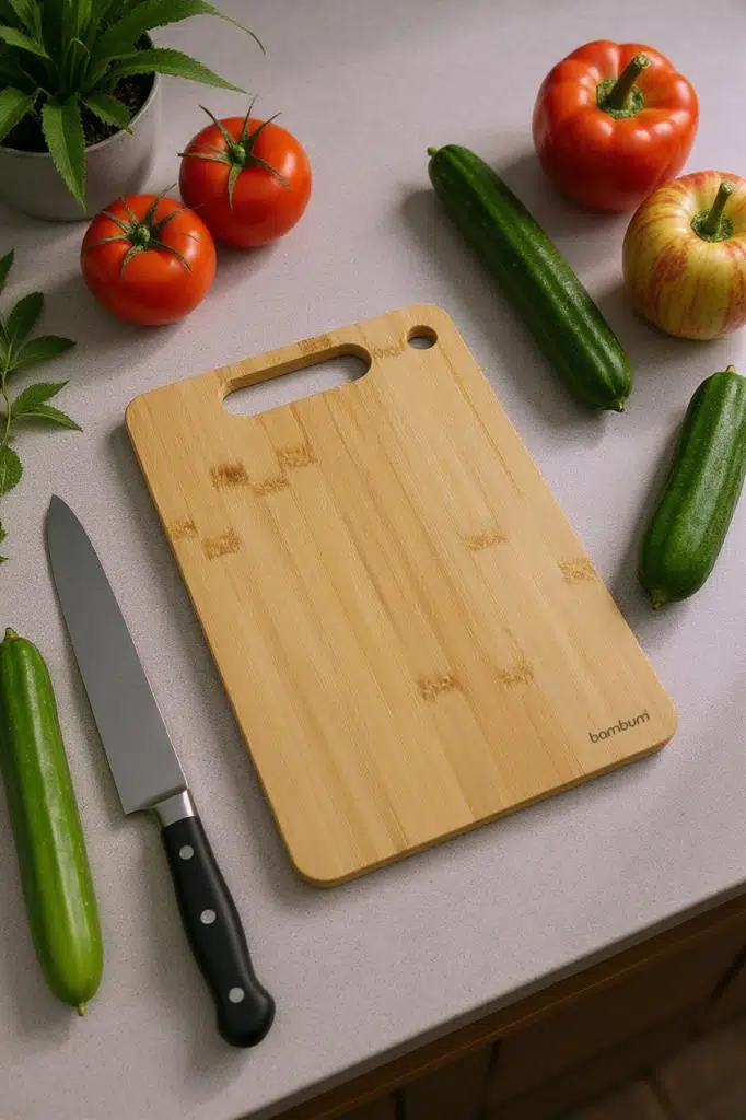 Bambu Yüzey: Sebze, meyve ve ekmek doğramak için bıçak dostu doğal bir yüzey sunar.