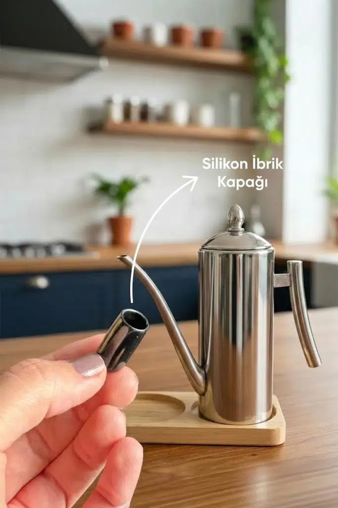 Koruyucu Kapak: İbrik ucuna takılan siyah silikon kapak, içerideki sıvının hava almasını engeller, dökülmeyi önler ve hijyen sağlar.