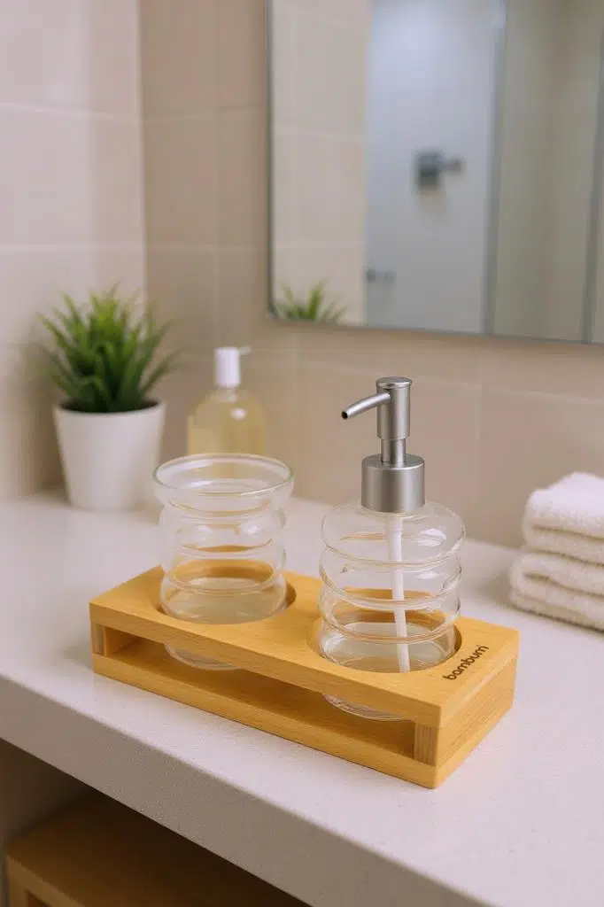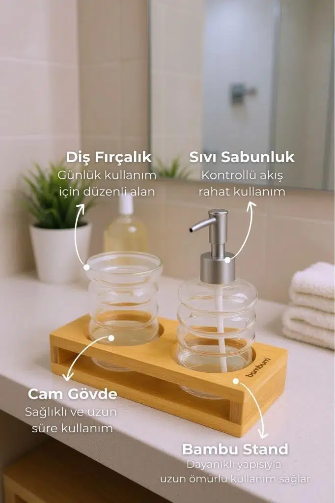 Tasarım: Zarif ve modern hatlara sahip sabunluklar, kendileri için özel olarak tasarlanmış bambu stand üzerine tam oturarak estetik bir bütünlük oluşturur. Stand, hem kaymayı önler hem de tezgahınızı düzenli tutar.