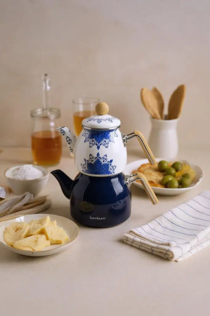 bambum çaydanlık takımı, bambu kulplu çaydanlık, lacivert çaydanlık seti, 2’li çaydanlık, büyük çaydanlık takımı, modern çaydanlık seti, çelik çaydanlık, bambu saplı çaydanlık, mutfak çay seti