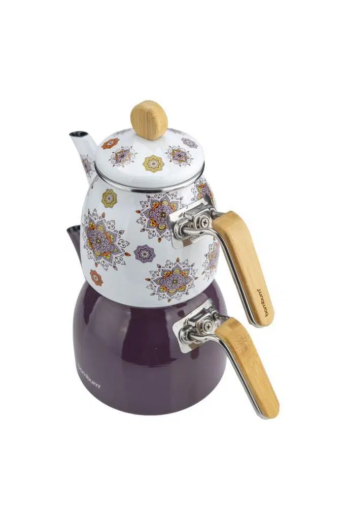 bambum çaydanlık, mor çaydanlık takımı, bambu kulplu çaydanlık, çelik çaydanlık seti, modern çaydanlık, büyük demlik seti, mutfak çaydanlık takımı, çeyizlik çaydanlık