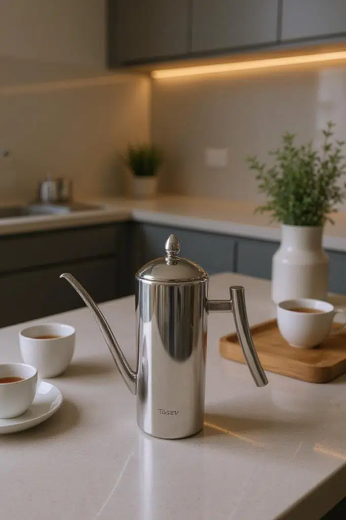 Taşev Zed Çok Amaçlı Çelik Demlik – Yağlık, tamamı paslanmaz çelikten üretilmiş dayanıklı ve şık yapısıyla mutfakta çok yönlü kullanım imkânı sunar. 1000 ml kapasitesiyle çay demlemekten sıvı yağ veya sos servis etmeye kadar farklı amaçlarla kullanılabilir. Parlak metal yüzeyi, modern mutfaklarda hem estetik hem de fonksiyonel bir görünüm oluşturur.