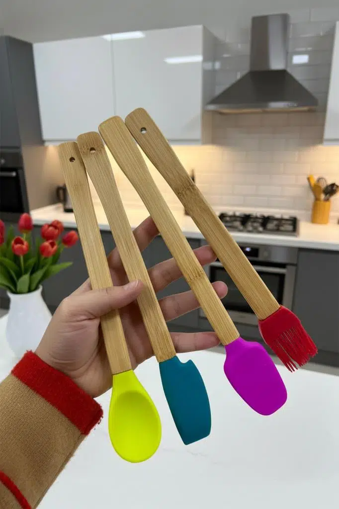 Bambum Zolly - 4'lü Büyük Boy Silikon Uçlu Bambu Spatula Seti | Renkli Mutfak Yardımcıları (30 cm)