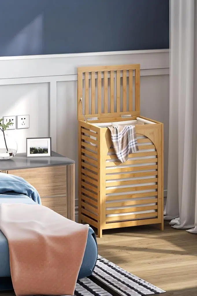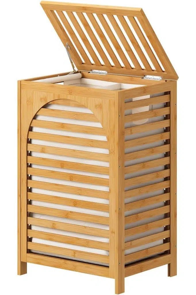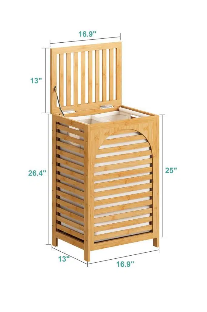 bambu çamaşır sepeti, 2 bölmeli kirli sepeti, 85 litre sepet, kapaklı çamaşır sepeti, ahşap kirli sepeti, banyo düzenleyici, çıkarılabilir astarlı sepet, doğal banyo aksesuarı, çamaşır ayırıcı