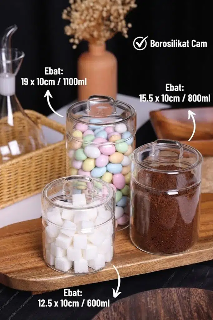 | Etiketler | Cecilia 3'Lü Cam Borosilikat Cam Kapaklı Kulplu Cam Saklama Kabı Kavanoz Şeffaf Set |