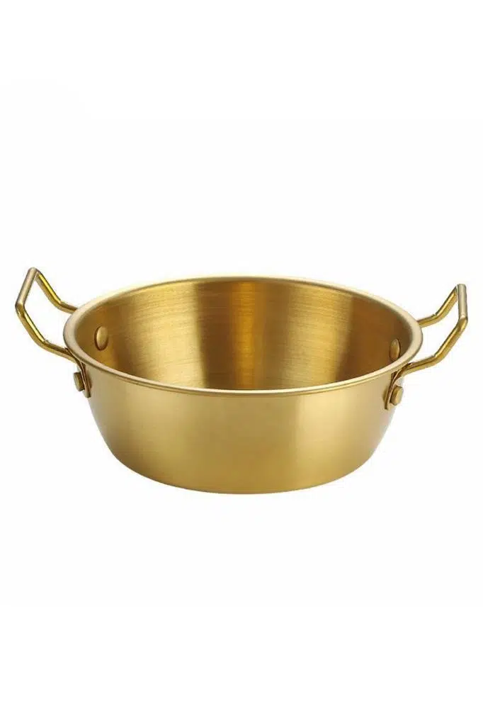 gold sosluk, mini sunum tavası, 10 cm tava, çelik sunum kabı, altın renkli kase, reçellik, kulplu sosluk, çerezlik, kahvaltılık sunum, paslanmaz çelik sunumluk, butik sunum