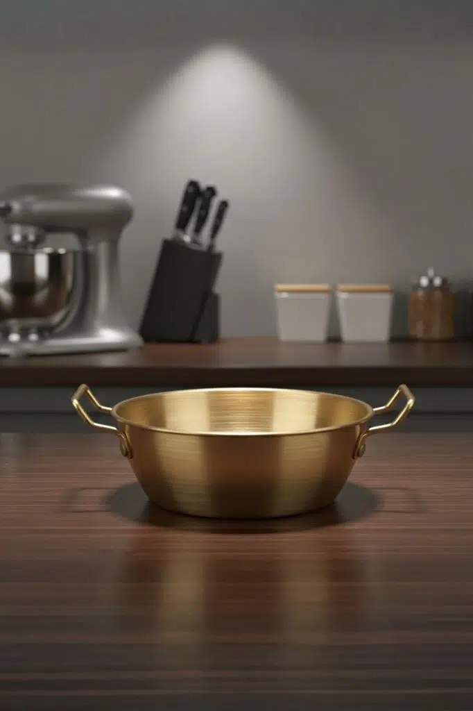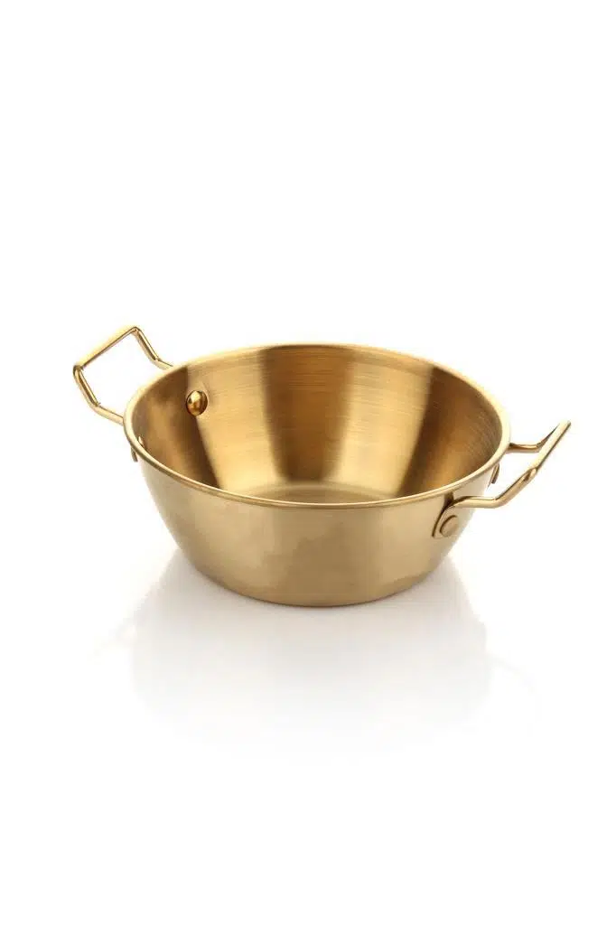 gold sunum tavası, 14 cm tava, çelik servis kabı, altın renkli kase, sıcak servis tabağı, kulplu sunumluk, meze tabağı, kahvaltılık sunum, paslanmaz çelik sosluk, büyük sosluk
