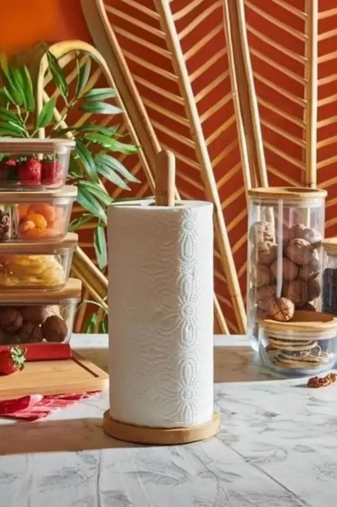 Mien Bambu Kağıt Havluluk, doğal ve estetik tasarımı ile mutfağınıza uyum sağlarken, kağıt havlularınızı her zaman elinizin altında tutmanıza yardımcı olur. Şık ve fonksiyonel bir mutfak aksesuarı arıyorsanız, bu ürün tam size göre!