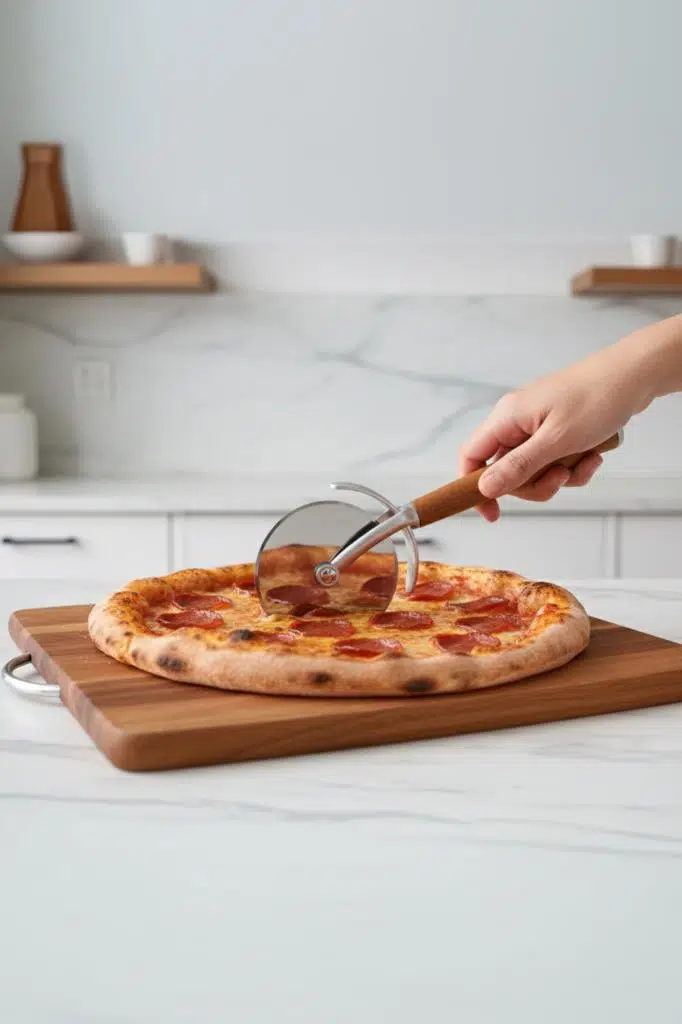 Pürüzsüz ve Kolay Kesim: Keskin döner bıçağı sayesinde pizzanızın üstündeki malzemeleri dağıtmadan, tek seferde pürüzsüz dilimler elde etmenizi sağlar.