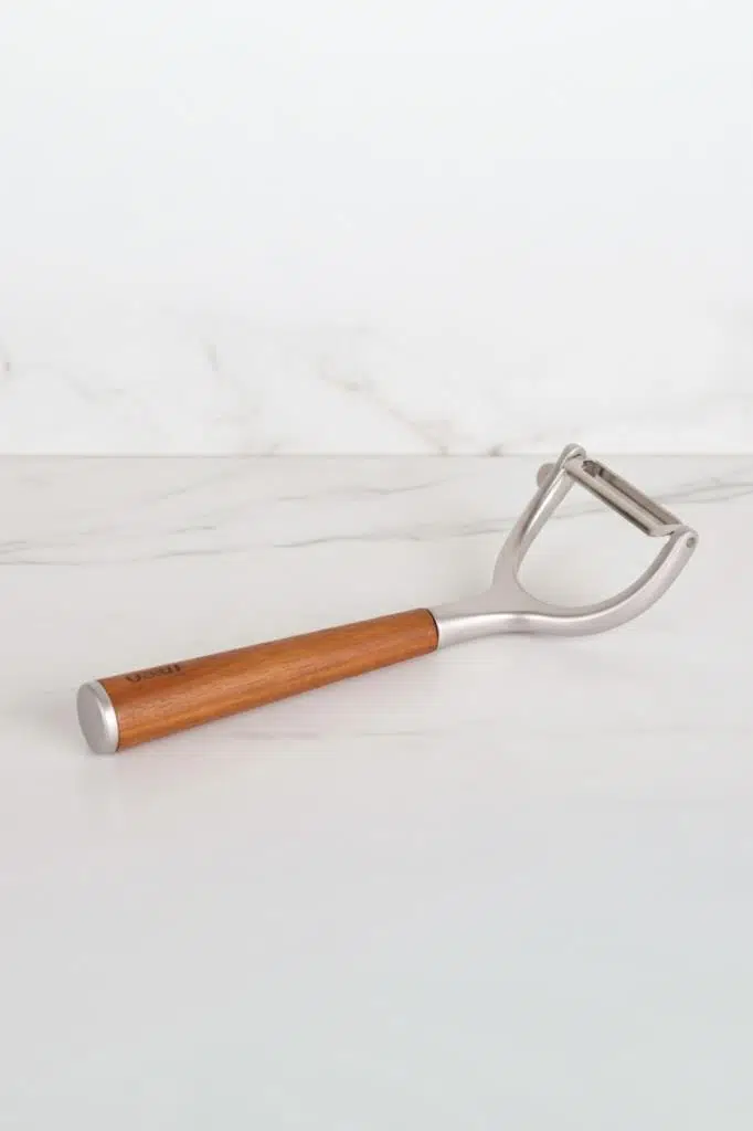 Tasarım: Paslanmaz çelik başlık en sert kabuklarda bile pürüzsüz bir soyma sağlarken, akasya ağacından yapılan ergonomik sap elinize tam oturur ve kaymayı önler.