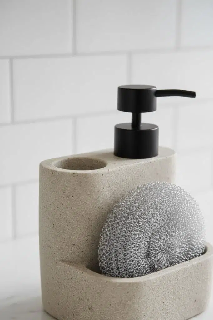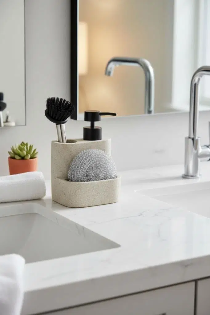 Ayrıca üzerinde bulunan bölmeler sayesinde sünger, fırça gibi temizlik aksesuarlarını düzenli bir şekilde saklamanızı sağlar. Hem dekoratif hem de işlevsel yapısıyla lavabo kenarında dağınıklığı ortadan kaldırır.