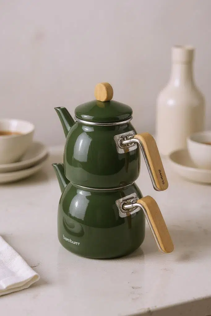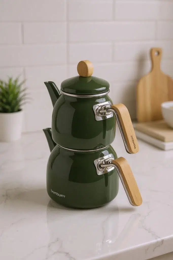 bambu kulplu çaydanlık, emaye çaydanlık seti, koyu yeşil çaydanlık takımı, sultan çaydanlık, modern mutfak çaydanlığı, indüksiyon uyumlu çaydanlık, 2’li çaydanlık seti