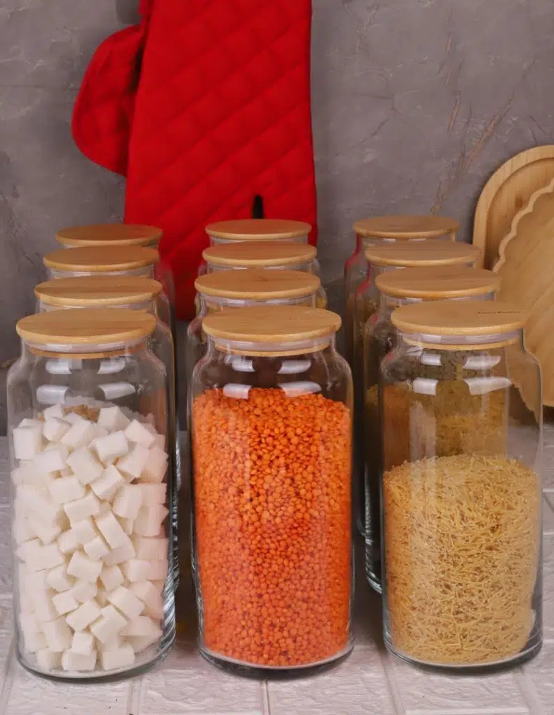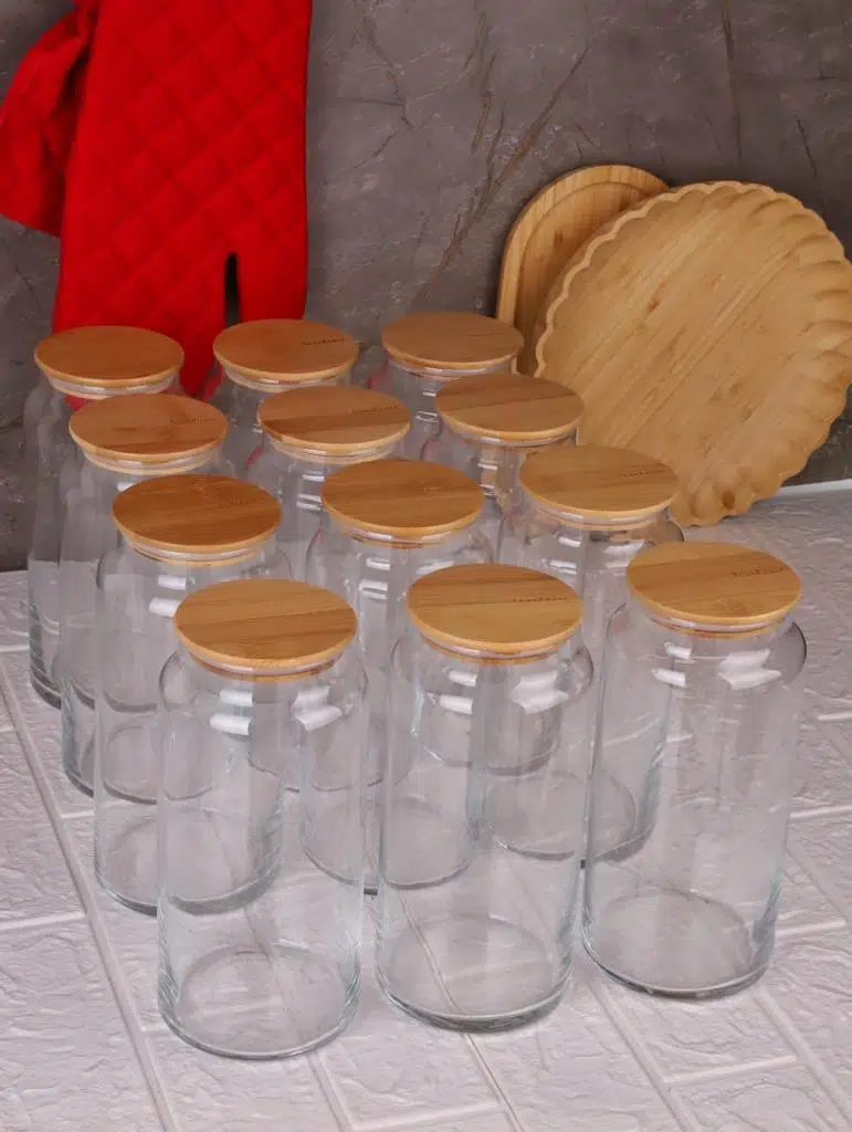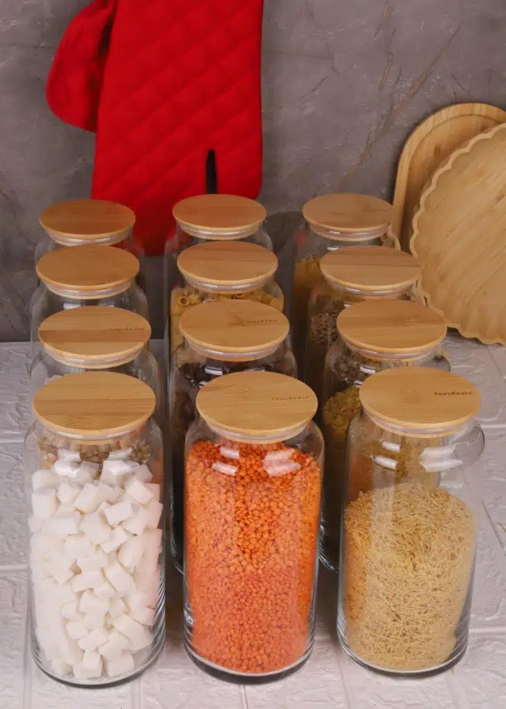 Bambum Zone 12’li Cam Saklama Kabı Seti, sade tasarımı ve doğal bambu kapaklarıyla mutfağınızda hem düzen hem zarafet oluşturur. Tamamı 1300 ml hacme sahip geniş cam kaplarıyla makarna, bakliyat, kahve, un, çay ve kuruyemiş gibi gıdalarınızı hijyenik bir şekilde saklamanıza olanak tanır. Vakumlu bambu kapak sistemi, gıdaların hava ile temasını keserek uzun süre taze kalmasını sağlar.