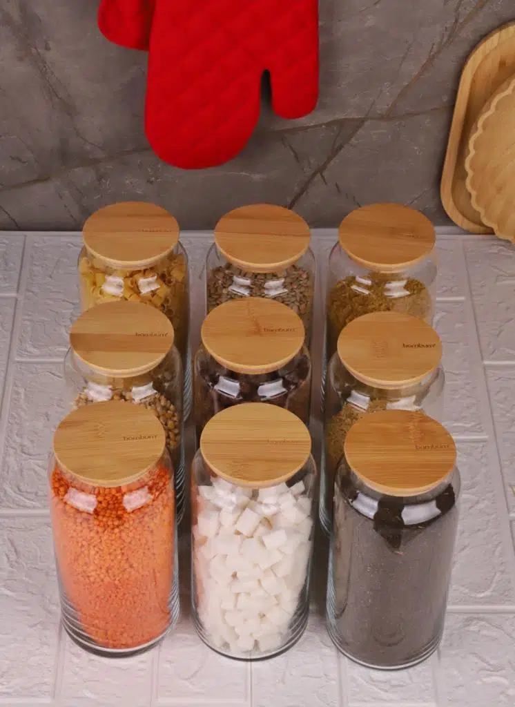 Bambum Zone 9’lu Cam Saklama Kabı Seti, doğal bambu kapakları ve geniş hacimli cam gövdeleriyle mutfakta hem şıklık hem de düzen sağlar. 1300 ml kapasitesiyle bakliyat, kahve, makarna, çay ve kuruyemiş gibi gıdalarınızı hijyenik şekilde saklamak için idealdir. Vakumlu kapak sistemi sayesinde gıdaların hava ile temasını önler, tazeliğini uzun süre korur.
